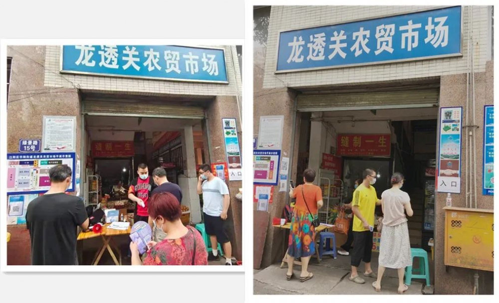 志愿者在菜市场出入口开展体温测量等志愿服务
