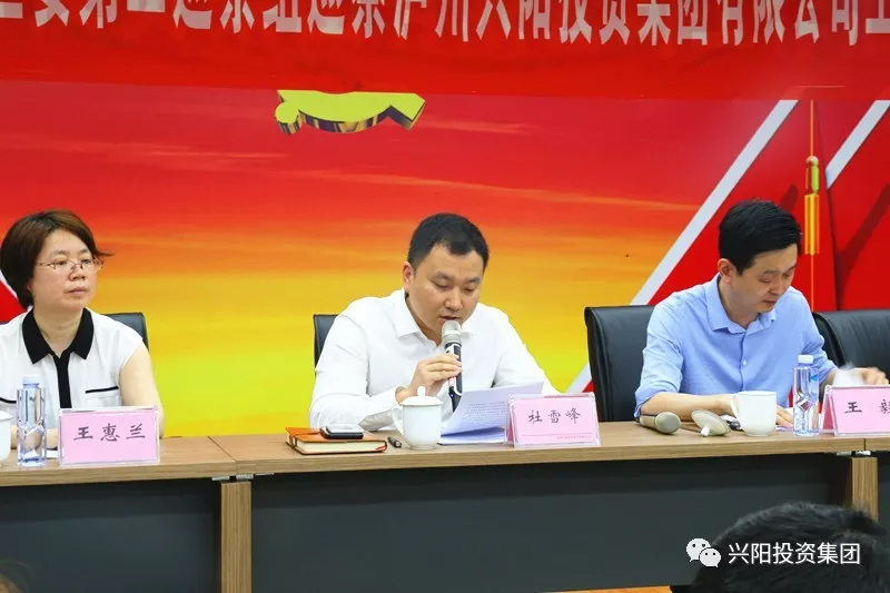 兴阳投资集团党委书记、董事长杜雪峰代表公司党委领导班子就贯彻落实区委巡察工作要求、配合做好巡察工作作表态发言。杜雪峰表示,将高度重视、统一思想,主动接受监督检查。把接受监督检查作为当前的一项重大政治任务,当作一次加强党性锻炼的机会,一次检验工作成效的机会,一次推进集团快速发展的机会,切实把思想和行动统一到区委巡察工作部署上来。以正确的态度、积极的状态、严谨的作风应对这次巡察。将在组织上严明纪律,保证工作顺利开展;在行动上积极支持,认真配合巡察工作;在问题上立整立改,确保工作取得实效。全面贯彻落实党的十九大精神和习近平总书记来川视察重要讲话精神、省委十一届二次全会和市委七届六次全会精神,不忘初心、牢记使命,埋头苦干、创造一流,为加快建设幸福美丽新江阳再立新功。